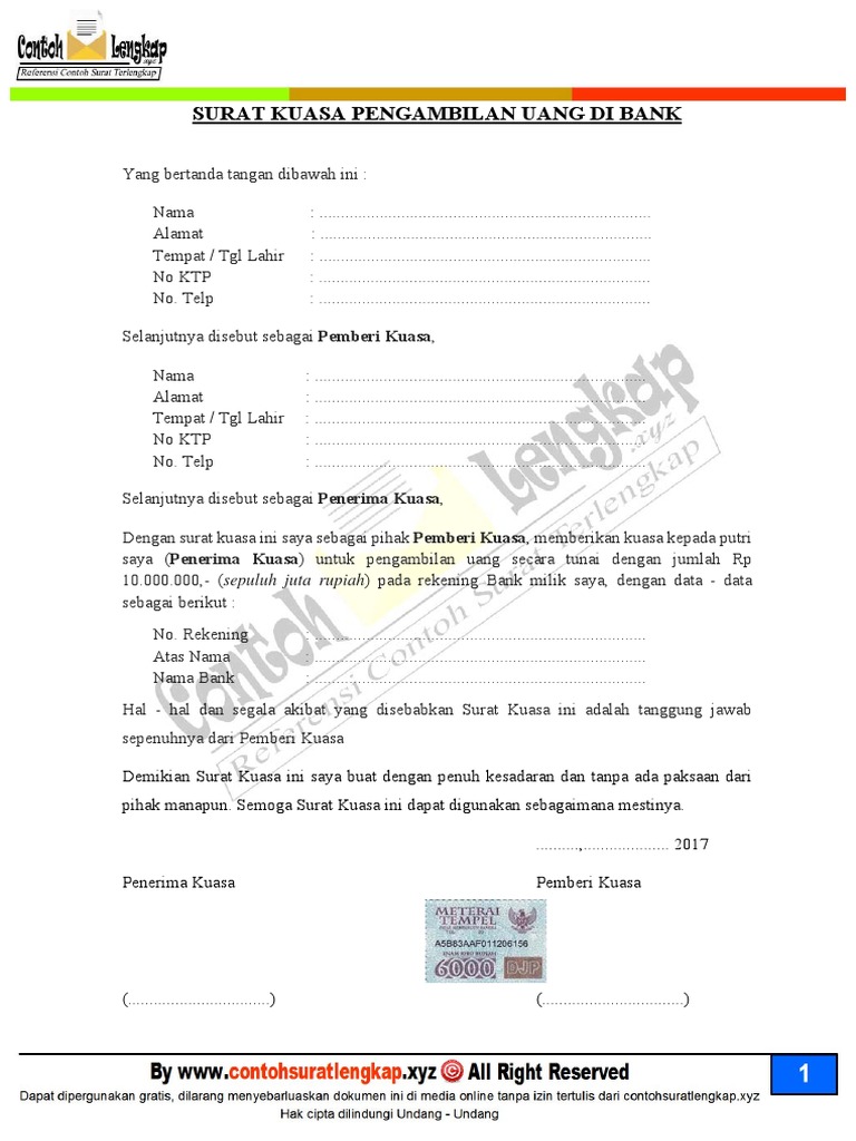 Dengan surat ini, saya sebagai pihak pemberi kuasa, memberikan kuasa kepada putra saya (penerima kuasa) untuk melakukan pengambilan uang secara tunai dengan jumlah rp. Surat kuasa adalah surat pemberian kuasa atau wewenang terhadap seseorang yang dipercaya untuk bertindak mewakili orang yang memberi kuasa karena orang yang memberi kuasa berhalangan hadir atau tidak dapat. Surat kuasa itu dr mana kita dapat pak. Keperluan mengambil uang di bank terkadang menjadi sangat penting apalagi dengan jumlah yang besar dan kepentingan yang banyak. Surat kuasa bank untuk mengambil warisan. Surat kuasa ini biasanya diperlukan bila seseorang yang berkepentingan memiliki halangan untuk mengambil uang. Nah itu melakukan pengambilan uang di bank dengan mewakilkan orang lain maka kita akan memerlukan surat kuasa. Nah, berikut ini kami sajikan buat anda. Surat kuasa ~ seperti yang telah satu tulis dalam artikel : Contoh surat kuasa yang benar dan turorial lengkap cara membuatnya. Berikut ini adalah salah satu contoh surat kuasa pengambilan uang di salah satu bank selaku otoritas pendanaan resmi. Salah satu contohnya adalah membuat surat kuasa pengambilan uang di bank. Namun tentu saja tidak semua orang dapat mengambil uang di bank.